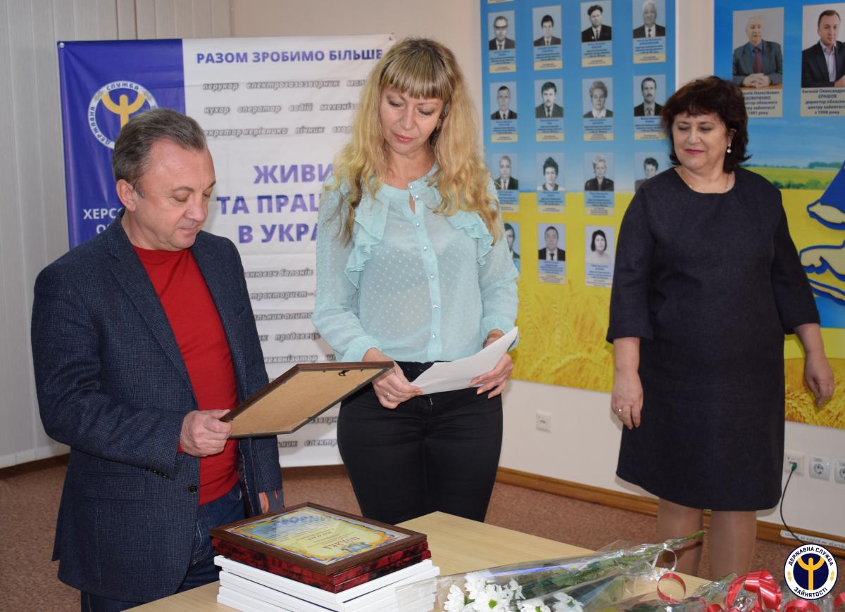 Директор Херсонського обласного центру зайнятості Євгеній Єрашов привітав присутніх із цією подією: «Нехай кожен день вашого життя буде щасливий і радісний, а родинне тепло і затишок допомагають у виконанні почесного і відповідального професійного обов’язку».