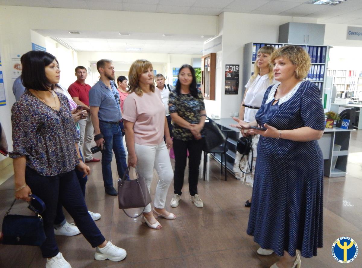 Заступниця директора Херсонського обласного центру зайнятості Людмила Барабаш провела оглядову екскурсію центрами зайнятості, знайомлячи з роботою фахівців.